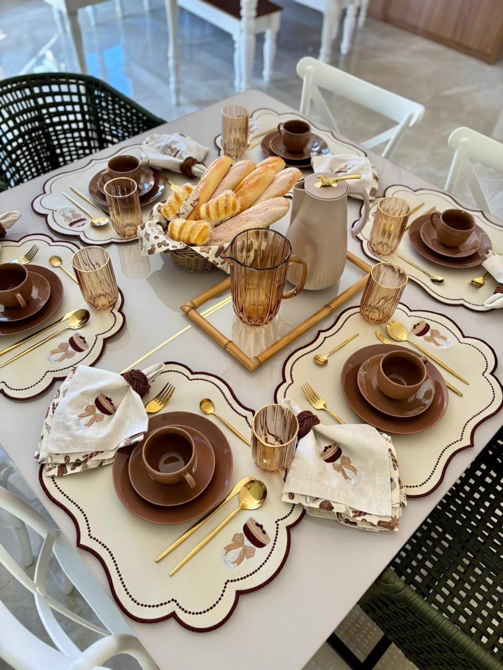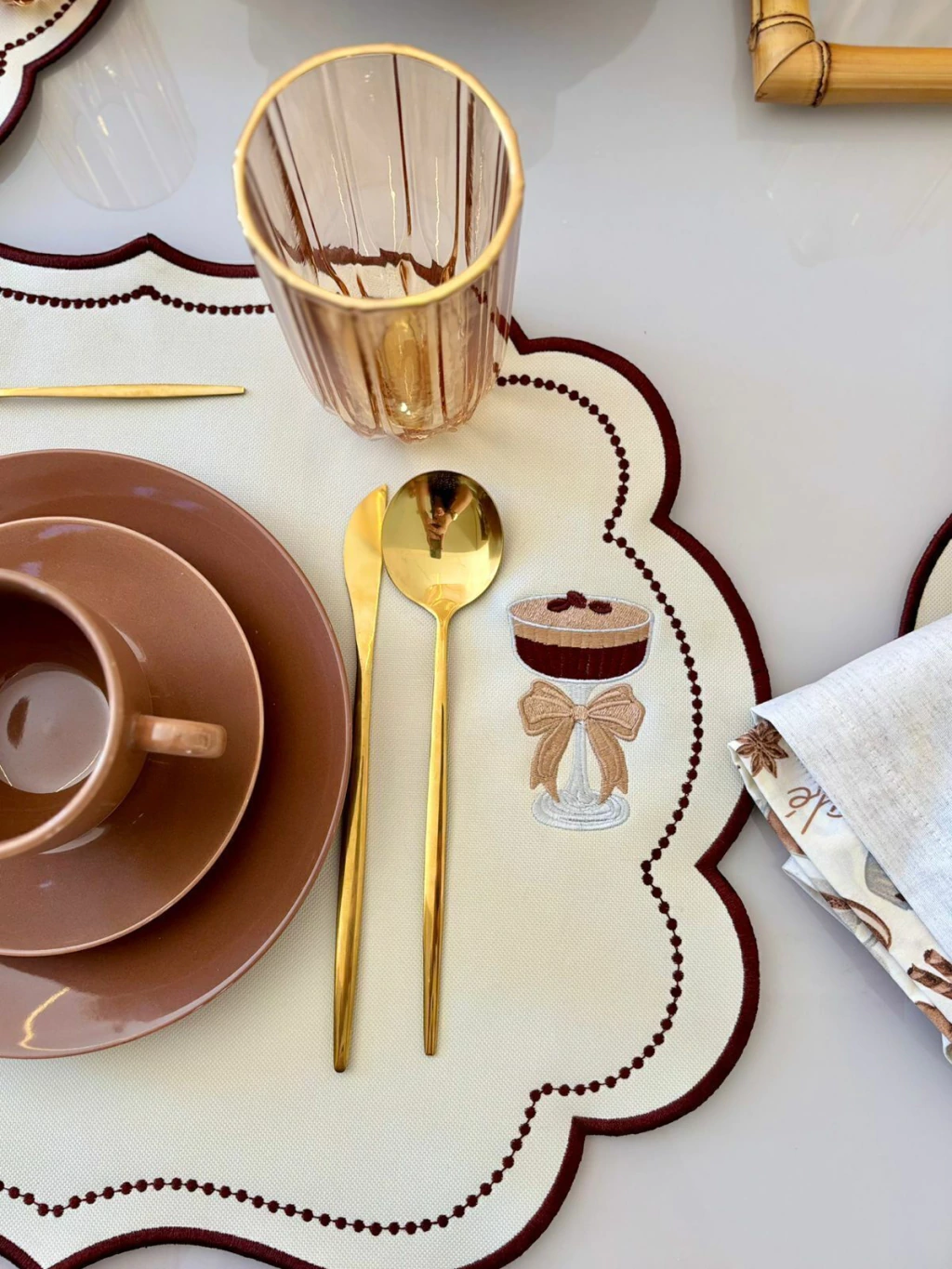 O lugar americano bordado café é a escolha perfeita para quem deseja uma mesa posta elegante e acolhedora. Produzido em tecido de alta qualidade, ele possui acabamento delicado em formato rendado e detalhe de bordado exclusivo com taça de café e laço, trazendo charme e sofisticação à composição. Ideal para café da manhã, brunch ou momentos especiais, esse acessório valoriza cada detalhe da sua mesa.