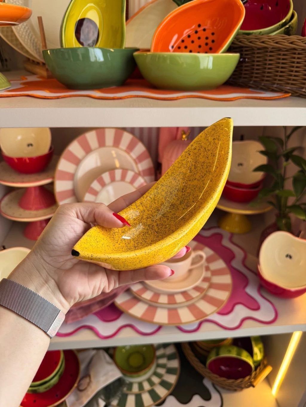 Bowl de cerâmica em formato de Banana dimensão 6x6x22cm, Amarelo com detalhe de manchas pretas, capacidade de 180ml
