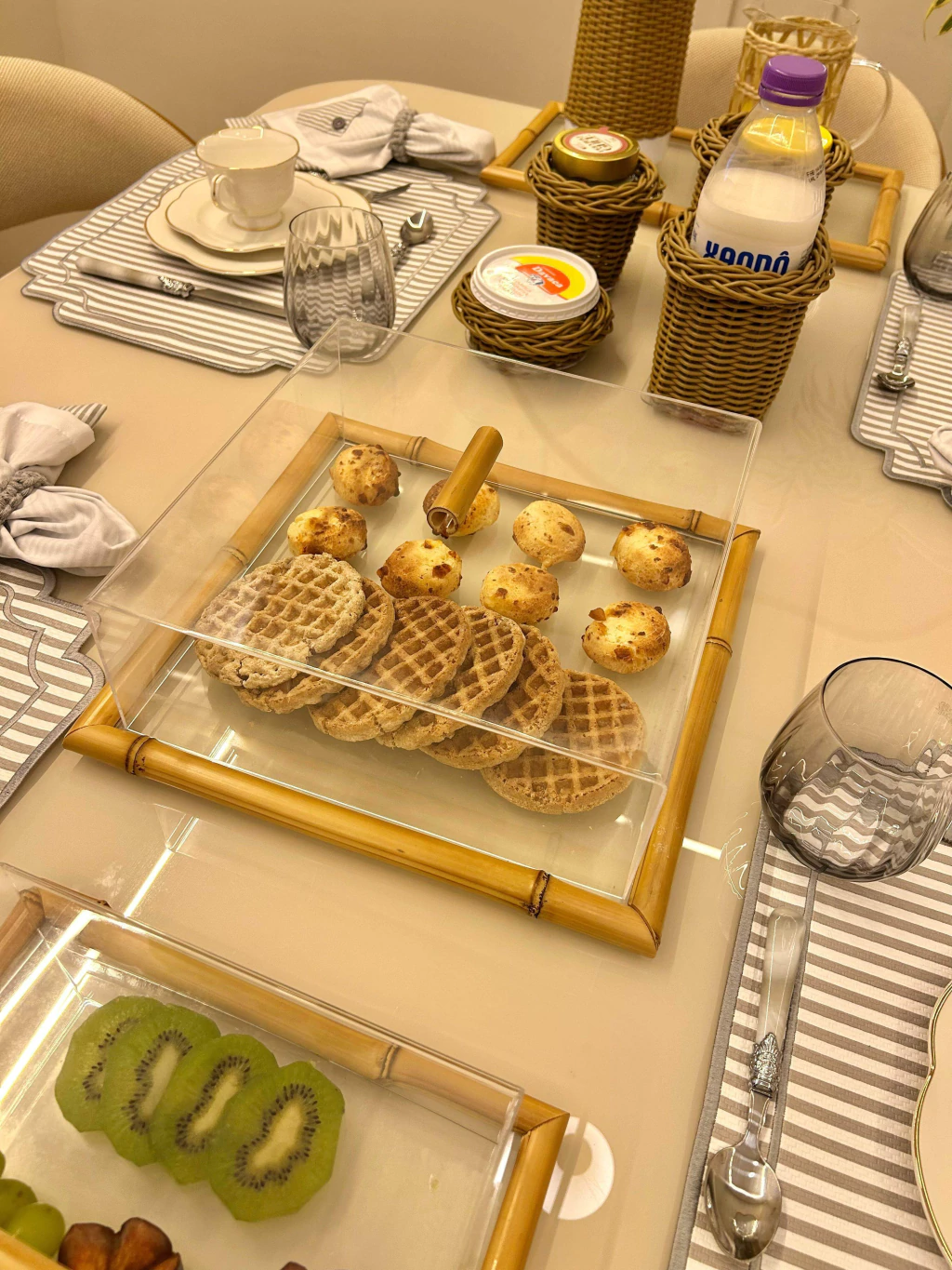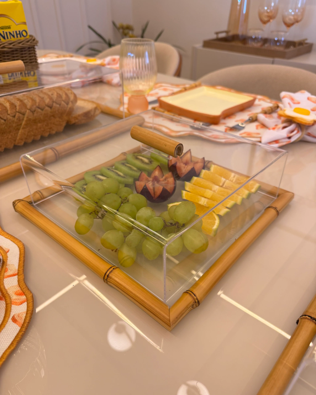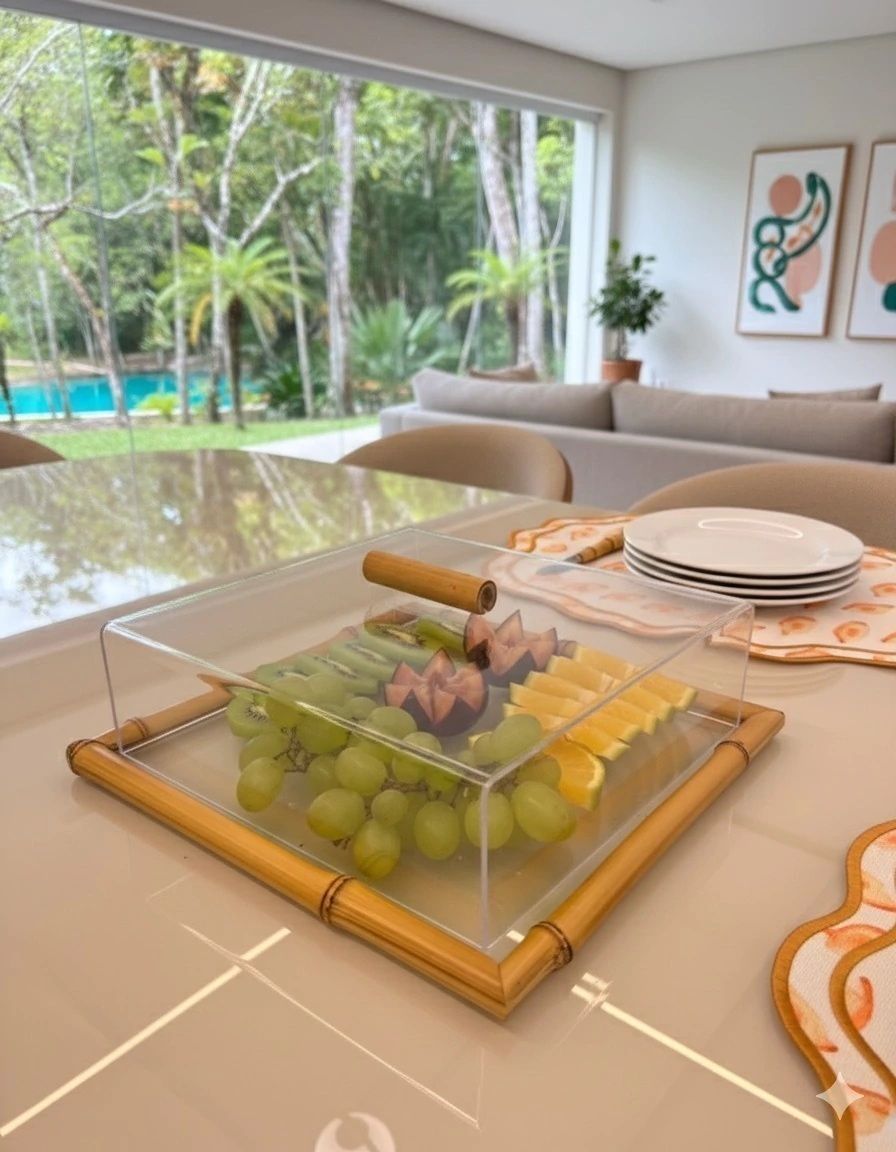 Embalagem: 1 Bandeja de Vidro e Bambu natural