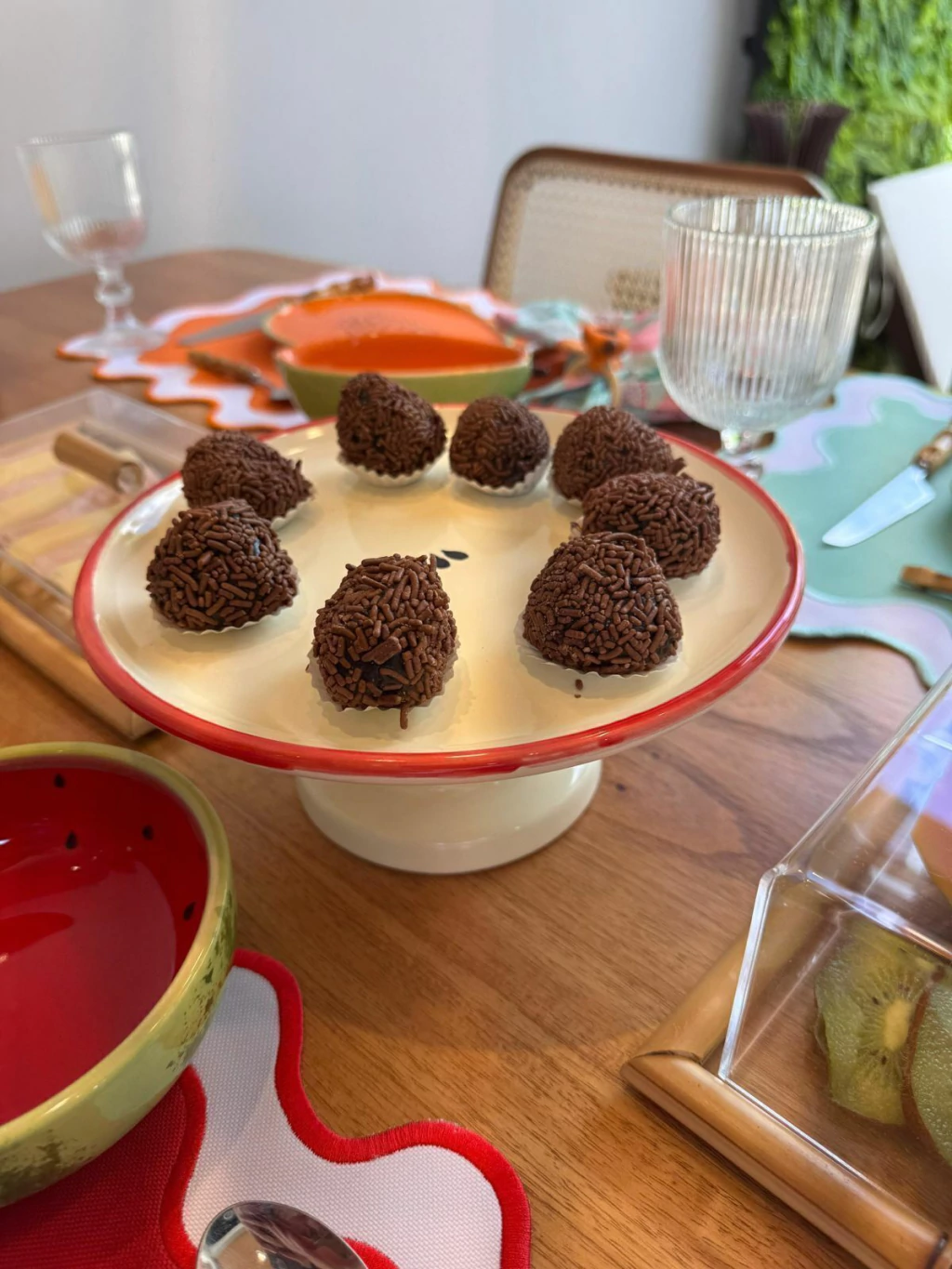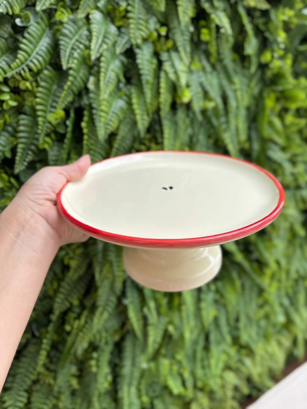 Boleira em formato de maçã, prato com borda vermelha e interior bege com detalhes que imitam sementes pretas dimensão 10,5x20cm,base bege.