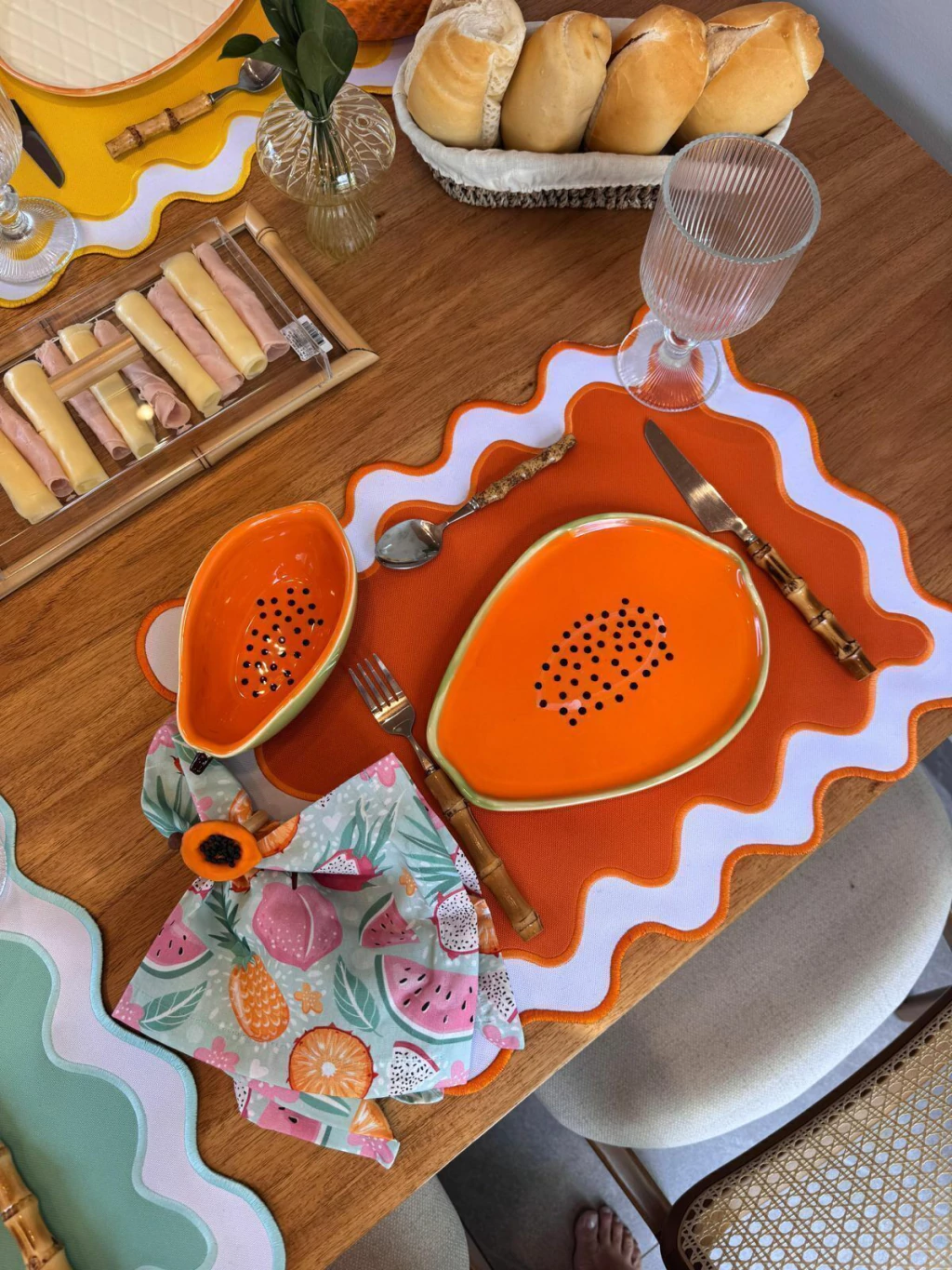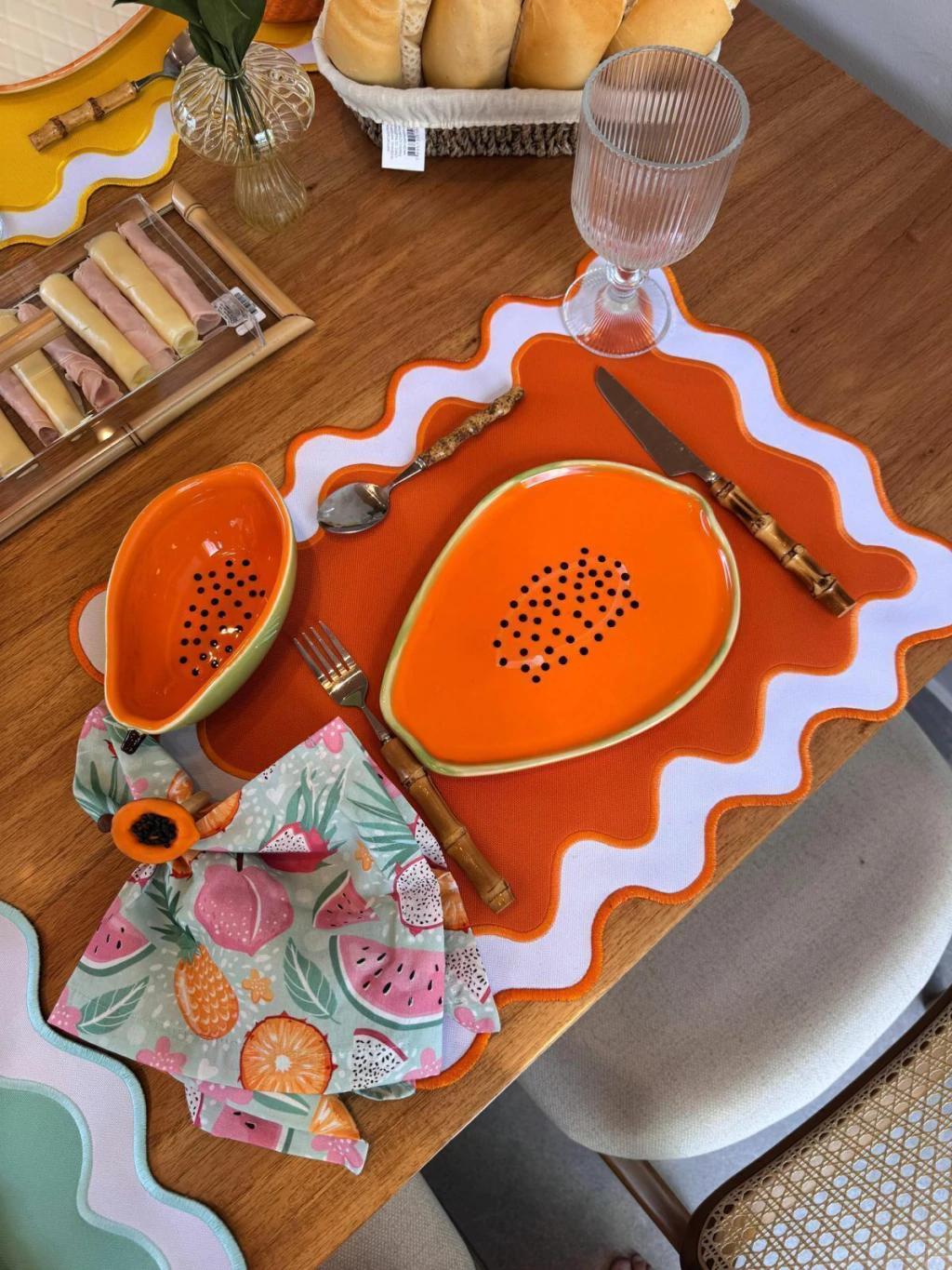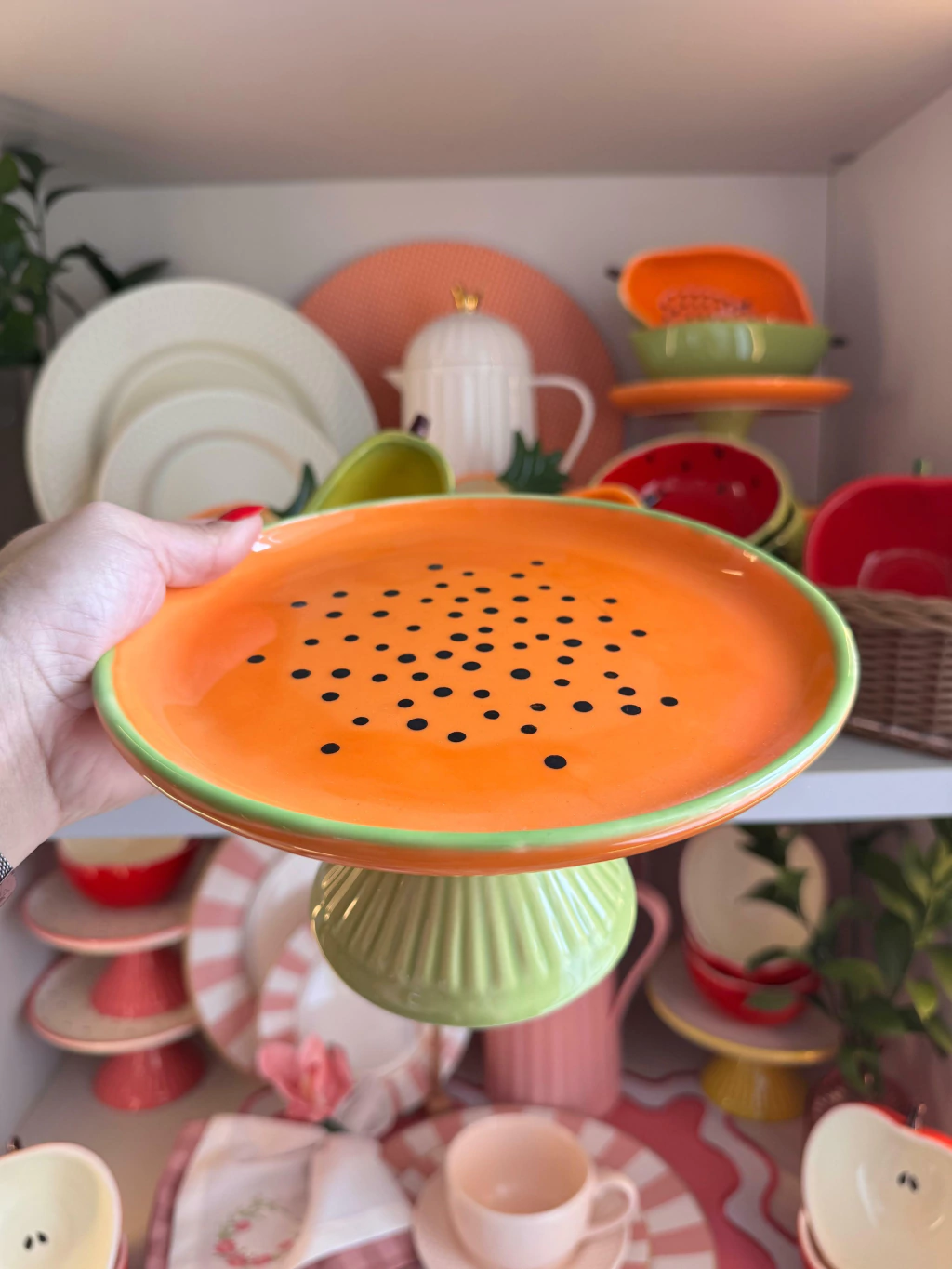Boleira em formato de mamão, Prato com borda verde e interior laranja vibrante, decorado com detalhes que imitam sementes pretas dimensão 10,5x20cm,base verde.