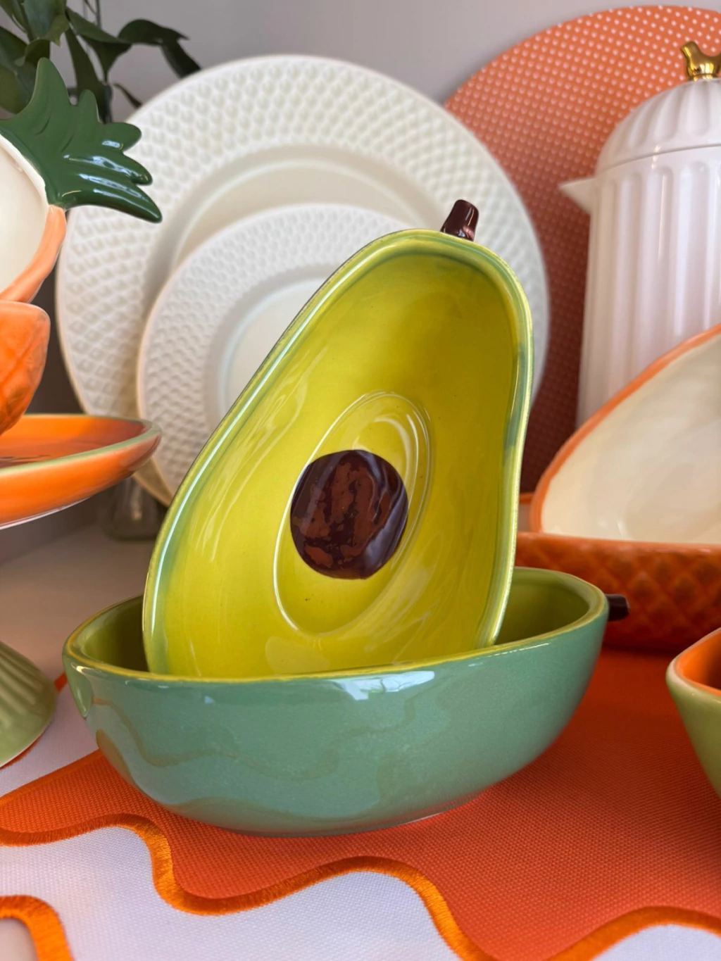 Bowl de cerâmica dimensão 6x10x17cm em formato de abacate, com exterior verde escuro e interior verde claro, decorado com detalhe no centro que imita semente marrom, capacidade de 320ml