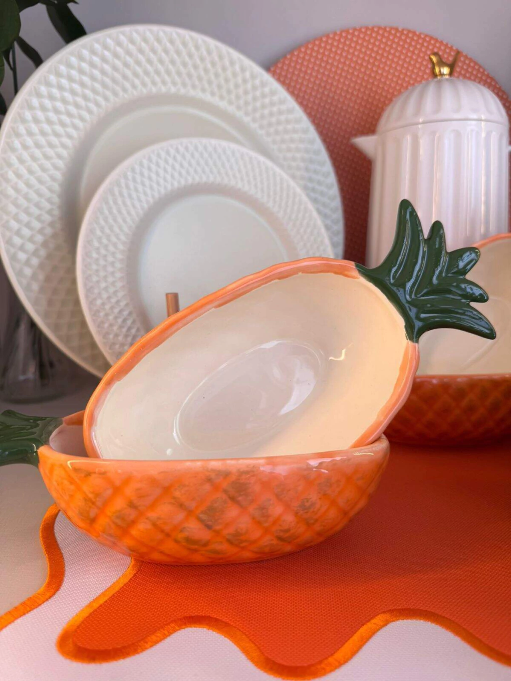 Bowl de cerâmica dimensão 5,5x10x19cm em formato de abacaxi, com exterior Laranja e textura , interior bege com detalhe da coroa em verde escuro, capacidade de 280ml