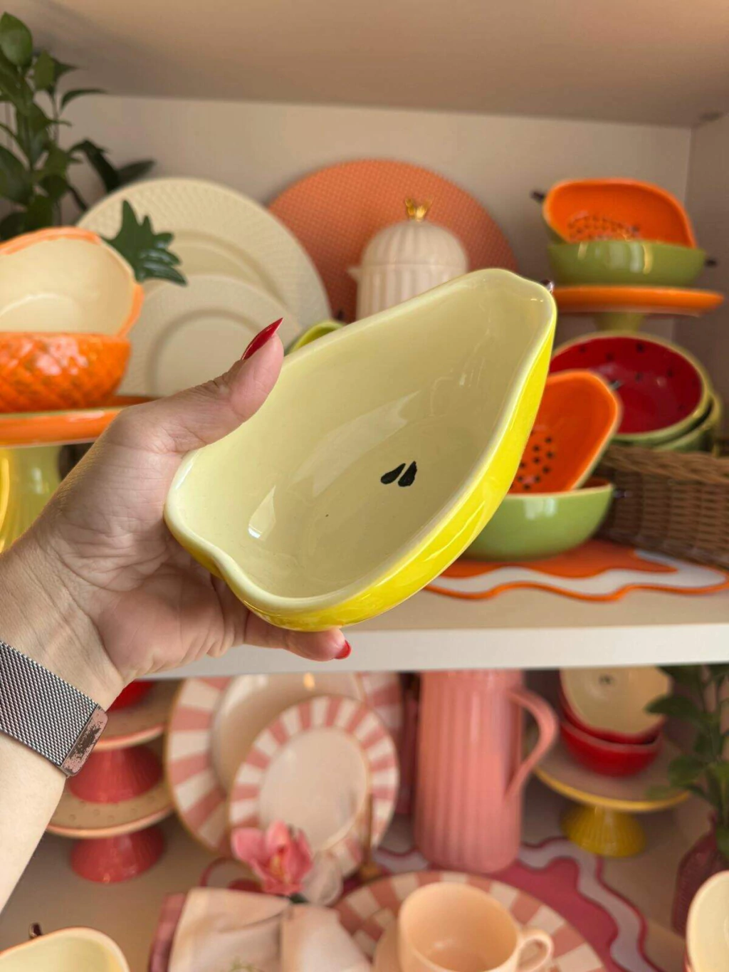 Bowl de cerâmica em formato de Pera dimensão 5,5x10,5x cm, com exterior amarelo brilhante, interior bege com detalhe de sementes pretas e cabinho marrom, capacidade de 320ml