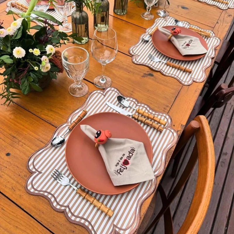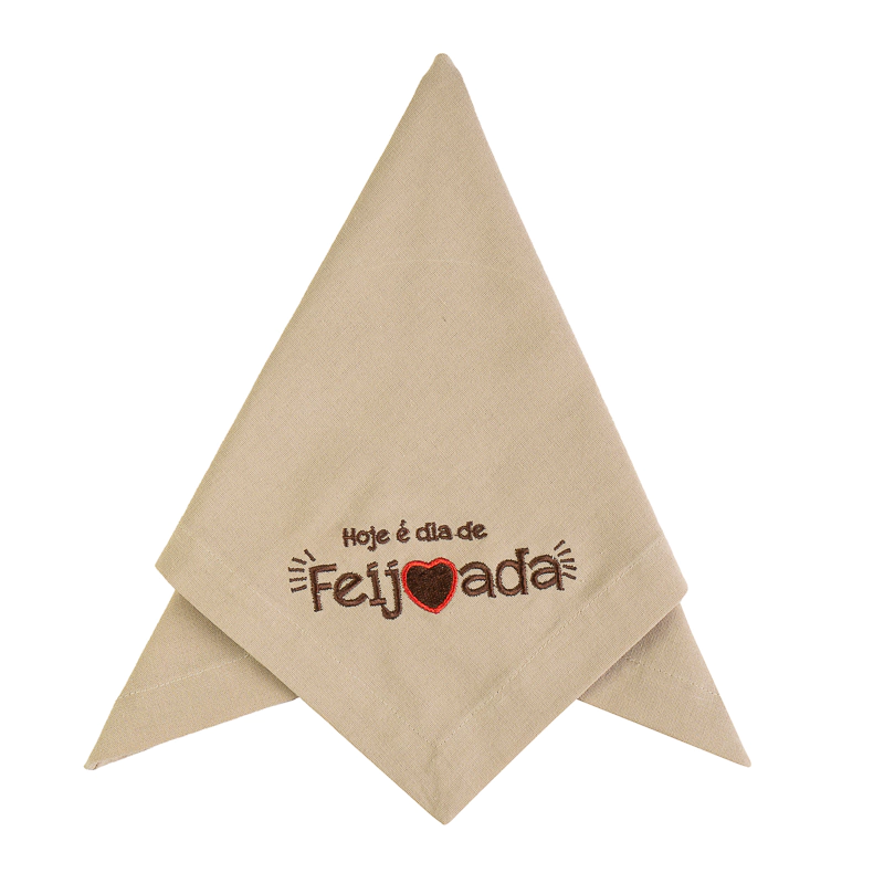 Guardanapo: Tecido linho com algodão, acabamento em canto mitrado com bordado feijoada