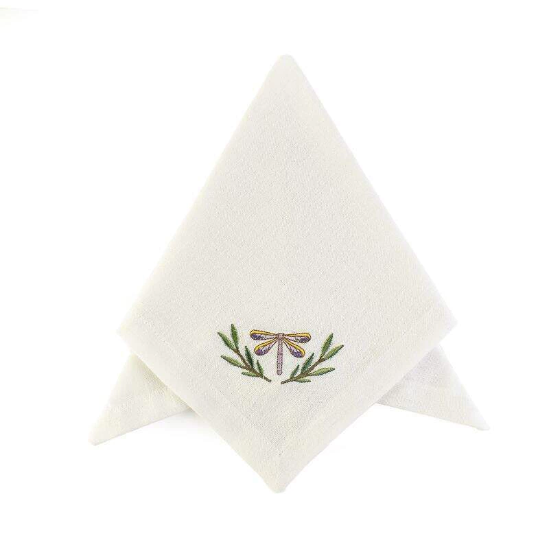 Descrição: Guardanapo em tecido linhão, com bordado de libélula.