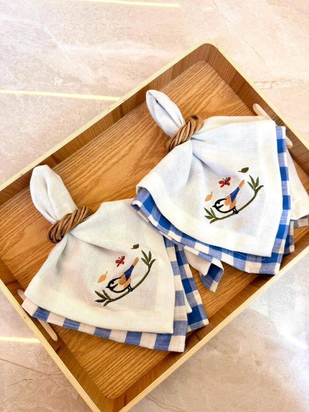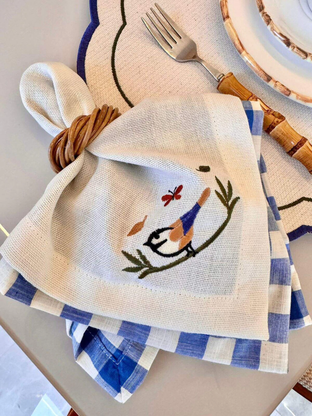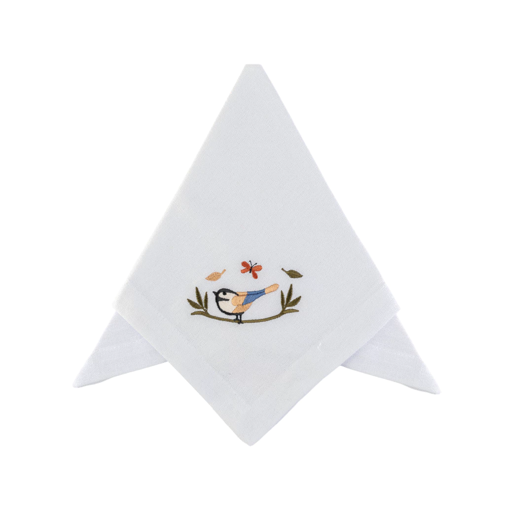 Guardanapo branco em tecido linhão, com bordado de borboleta.