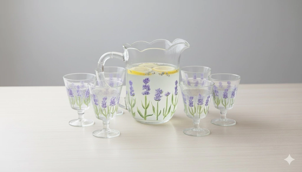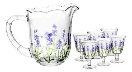 Produzido em vidro de alta qualidade, o conjunto oferece resistência e transparência impecável, realçando a cor das bebidas e valorizando a apresentação. A decoração com lavandas traz um charme provençal à sua mesa, tornando cada encontro ainda mais acolhedor e elegante.