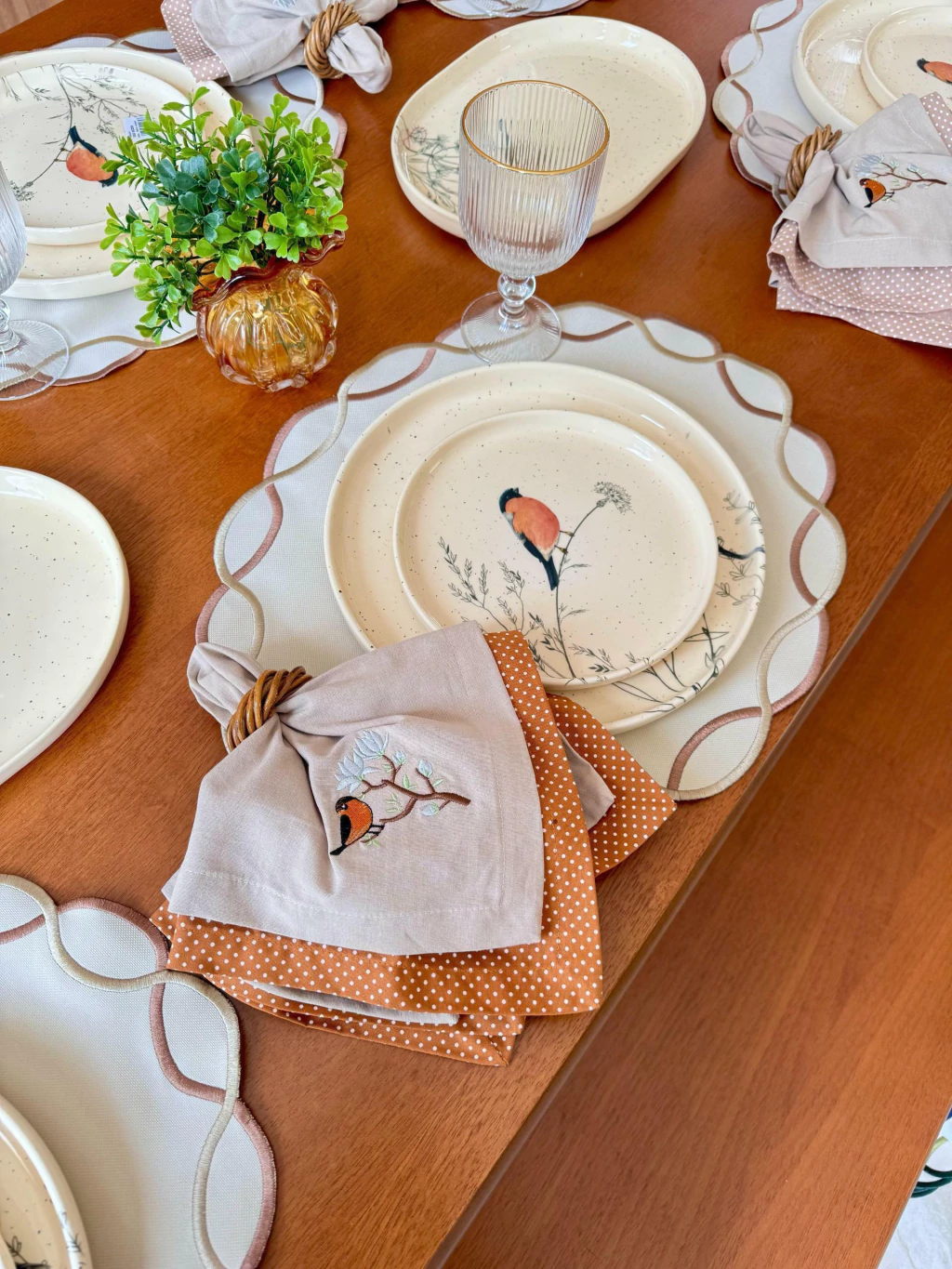 O destaque fica por conta do bordado impecável nas bordas, em tons de verde, que cria um contorno delicado e sofisticado, trazendo harmonia e elegância para a sua mesa posta.
