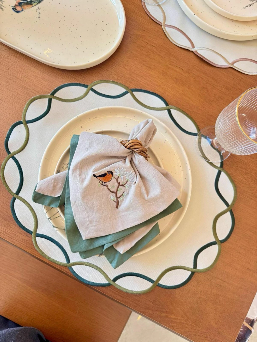 O destaque fica por conta do bordado impecável nas bordas, em tons de verde, que cria um contorno delicado e sofisticado, trazendo harmonia e elegância para a sua mesa posta.