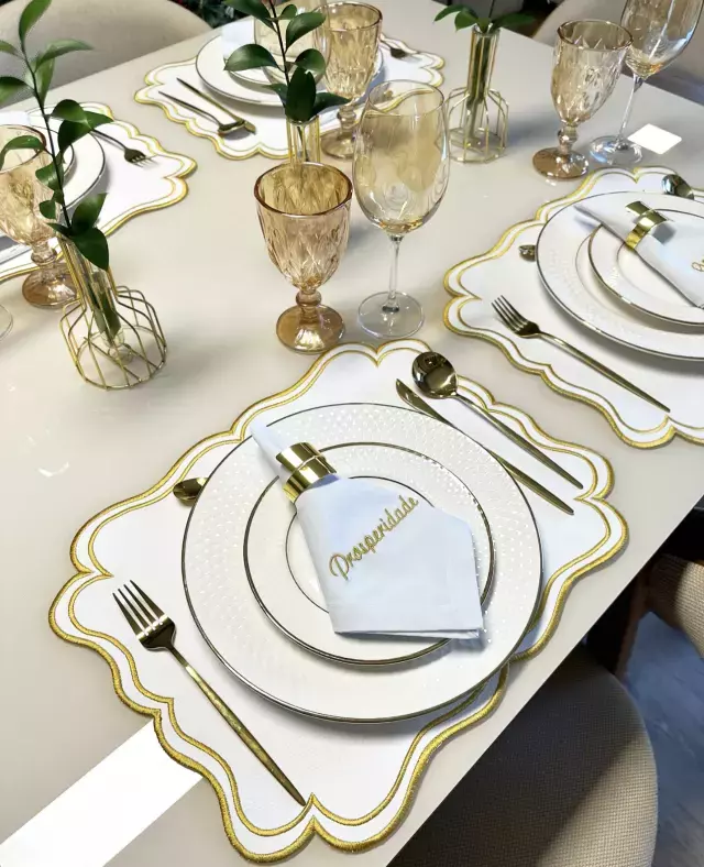Transforme suas refeições em momentos memoráveis com o Lugar Americano Corino Branco Com Dourado - Prosperidade: elegância, facilidade de limpeza e um toque de luxo para o seu dia a dia.