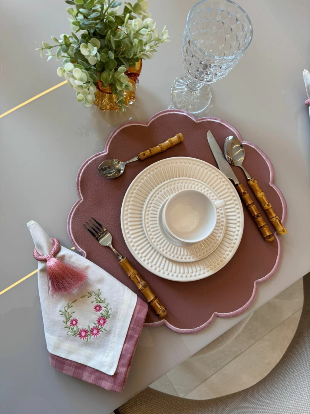 Além de fácil limpeza, o courino proporciona um toque elegante, enquanto o bordado delicado valoriza a composição da mesa. Ideal para almoços em família, jantares especiais ou celebrações, o Americano Round é a escolha perfeita para quem busca charme em cada detalhe.