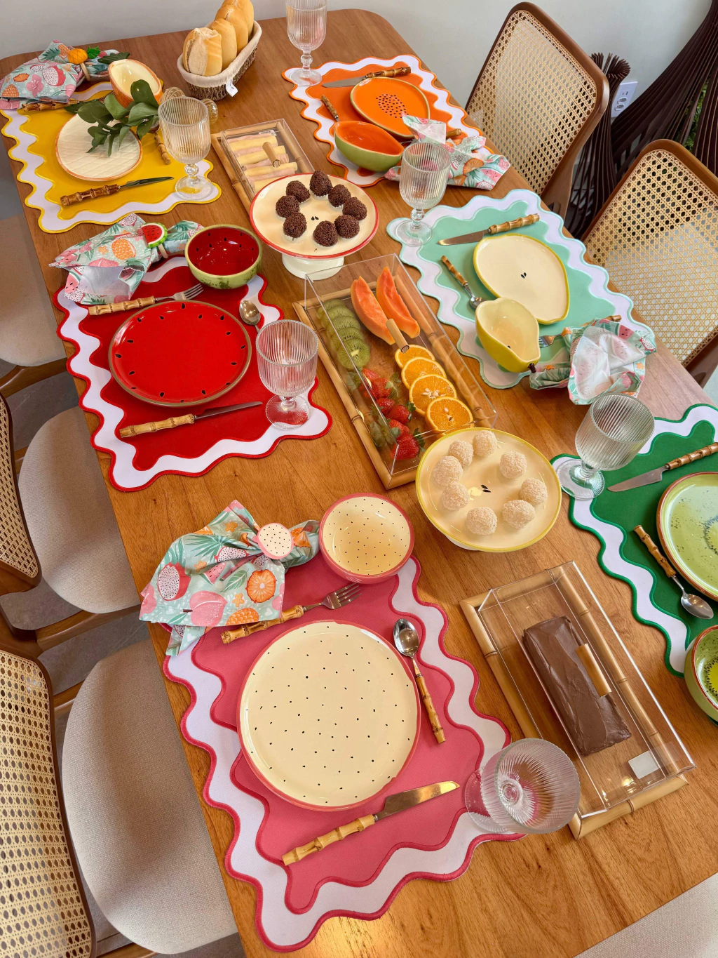Disponível em várias cores, ele faz parte das coleções Tutti Frutti e Divertidamente, que celebram mesas alegres, modernas e cheias de estilo. Ideal para transformar qualquer refeição em um momento ainda mais especial.