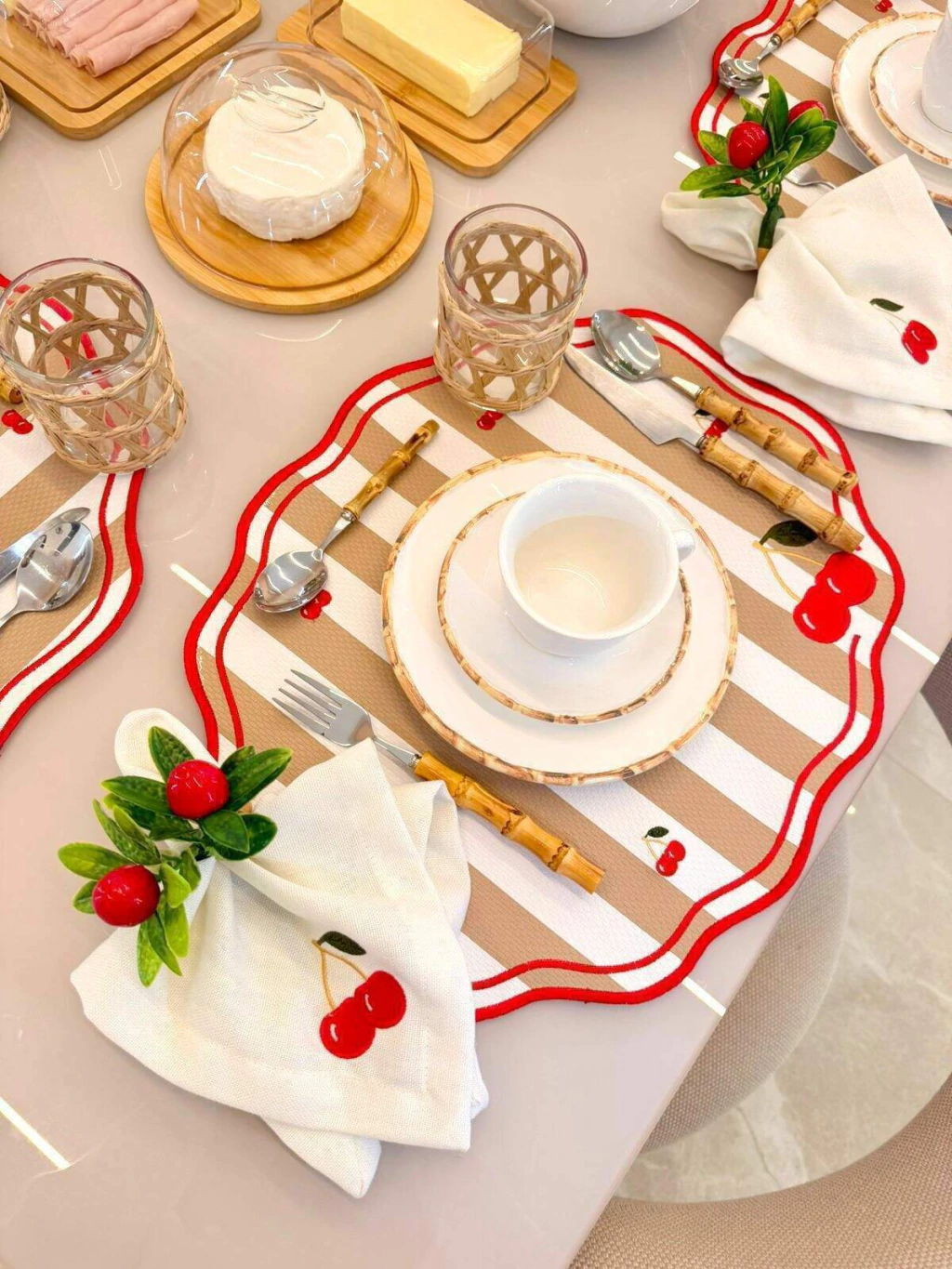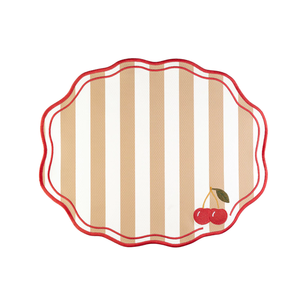 Lugar Americano listrado, de formato orgânico produzido em couro ecológico, com bordado em todo o contorno da peça, com mini cerejas.