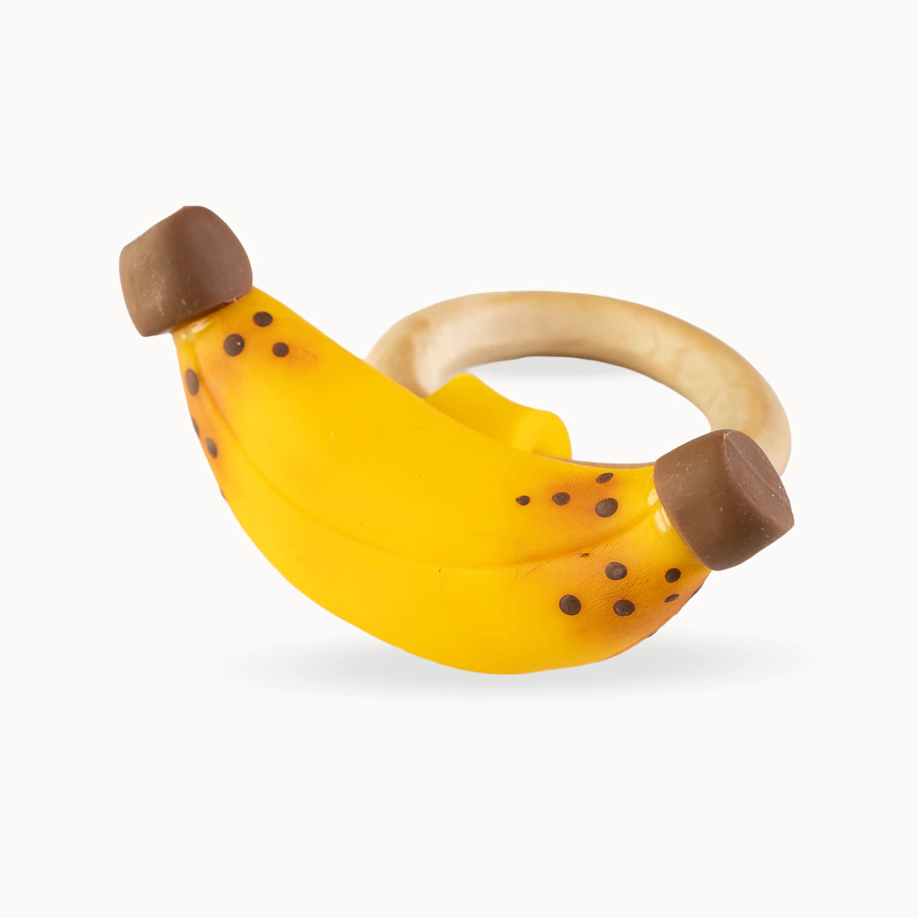 O formato icônico da banana é reproduzido com detalhes em resina de alta qualidade, garantindo uma cor amarela vibrante e um acabamento impecável. A argola de madeira cria um contraste elegante e natural.