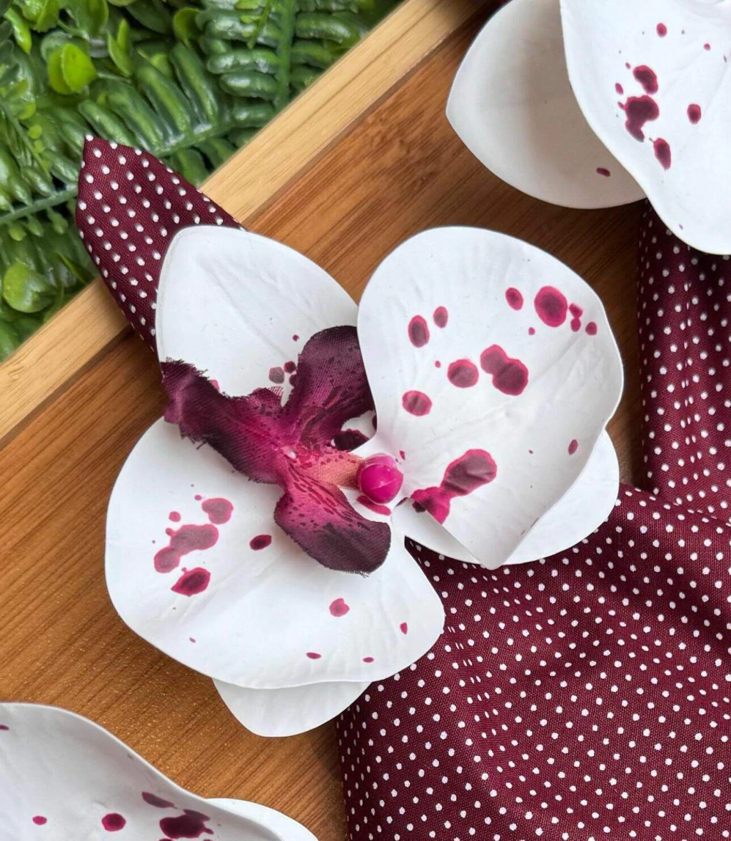 Complete sua mesa com nosso elegante Porta Guardanapo Orquídea Branca e Vinho - Toile de Jouy