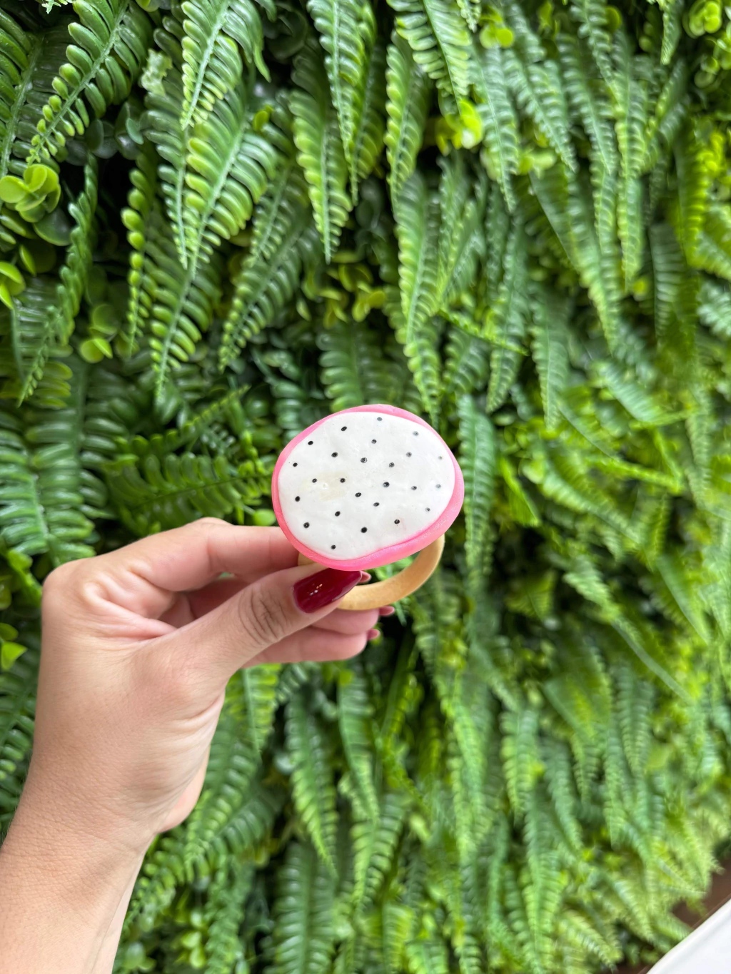 O contraste vibrante do rosa com o interior branco salpicado de sementes é recriado com perfeição em resina de alta qualidade, garantindo um acabamento impressionante e duradouro. A argola de madeira natural equilibra a peça com um toque de calor.