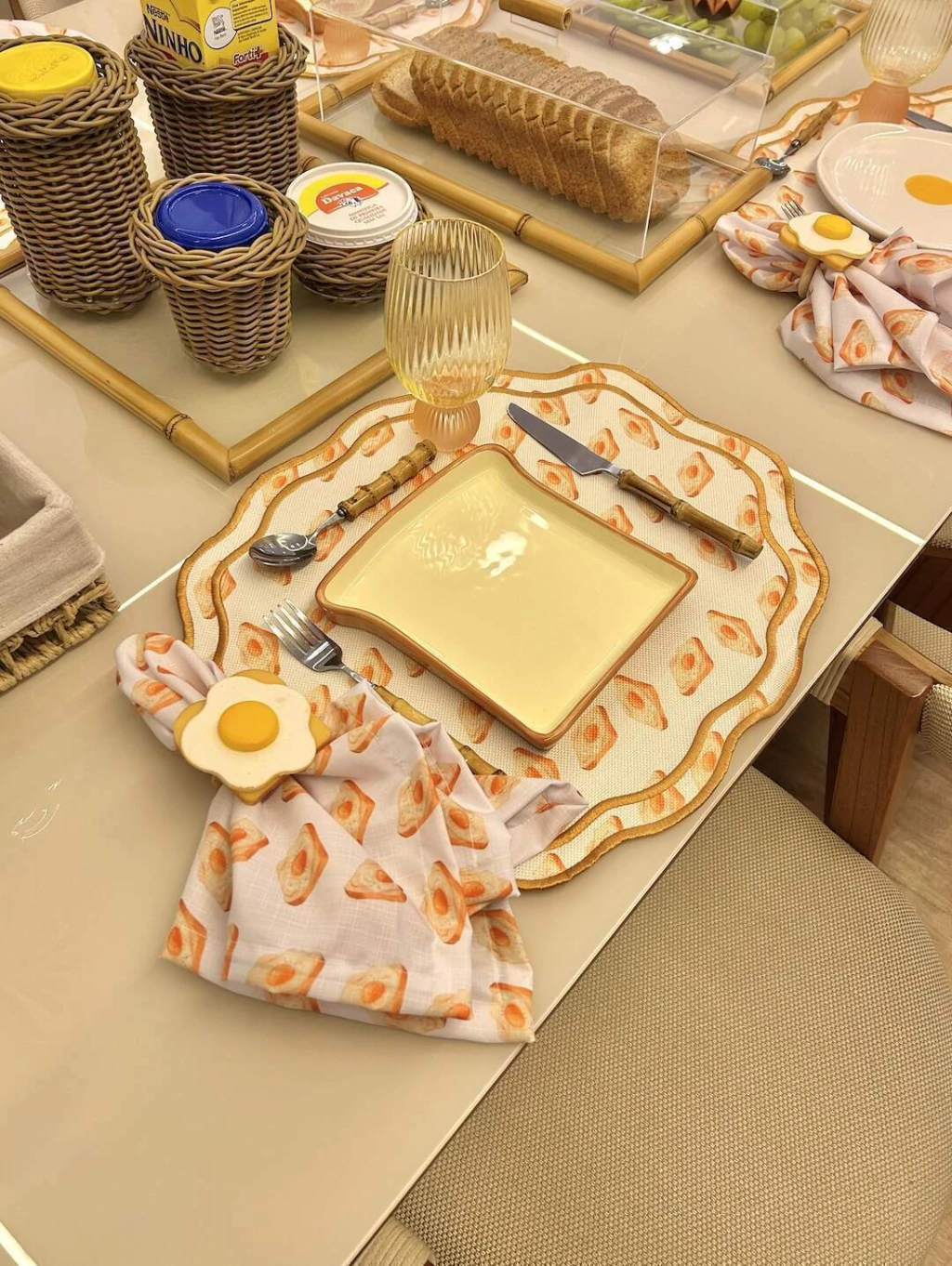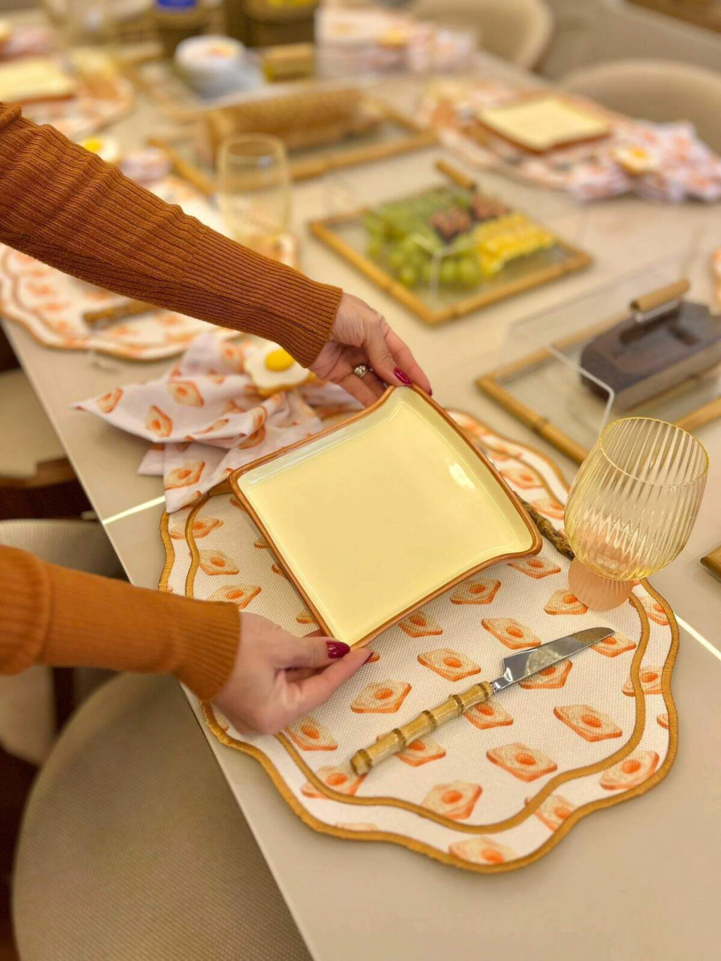 Prato de sobremesa de cerâmica em formato de formato de mamão, com borda verde e interior laranja vibrante, decorado com detalhes que imitam sementes pretas dimensão 1,5x24x 18cm.