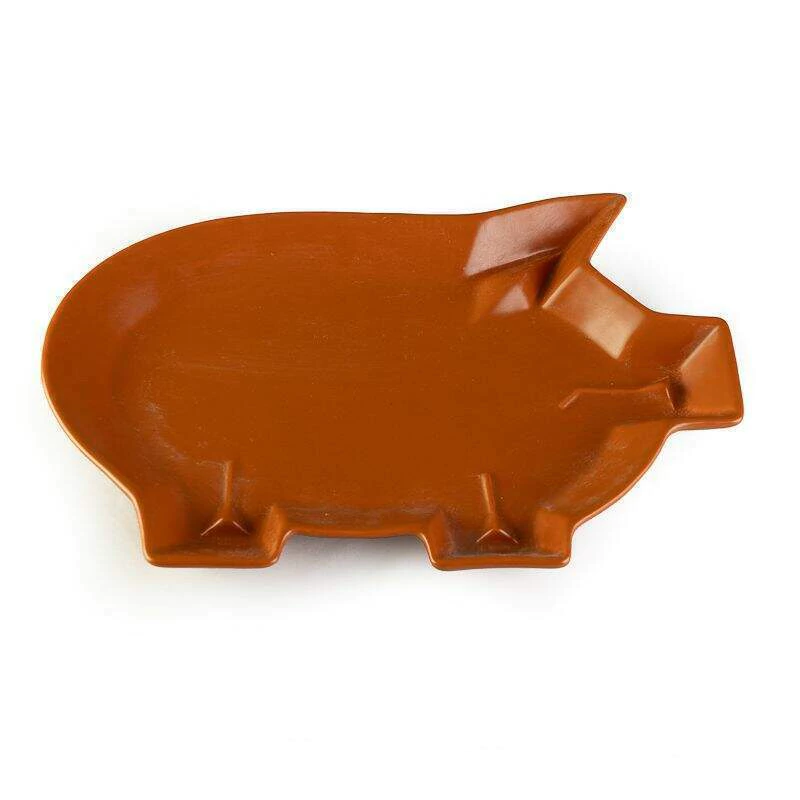 Prato com desenho de porco, em cerâmicas fosca na cor caramelo