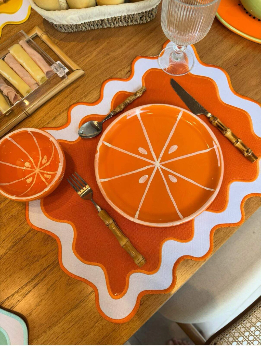 Prato de cerâmica dimensão 1,5x23cm em formato de laranja, interior laranja brilhante, bordas e detalhes desenhando os gomos e semente em brancos