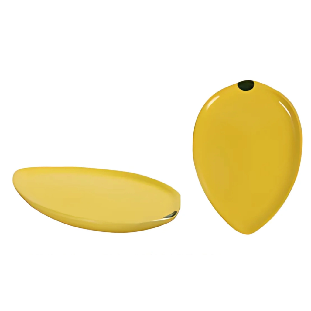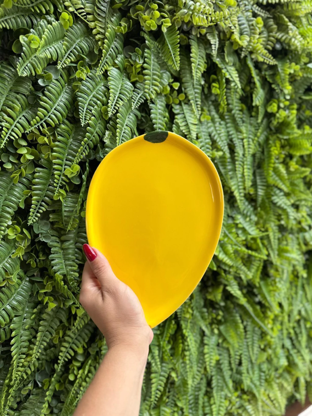 Prato de sobremesa de cerâmica em formato de formato de abacate, com borda verde escuro e interior verde claro, decorado com detalhe que imita semente marrom dimensão 1,5x25x 18cm.