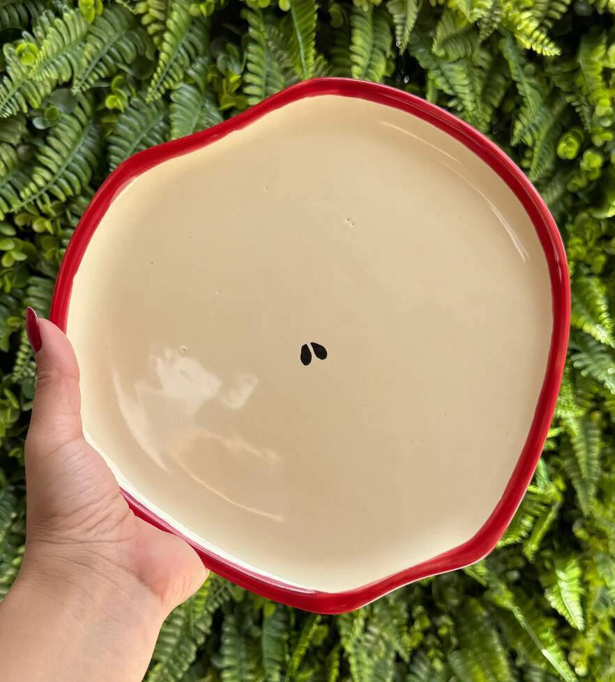 Prato de sobremesa de cerâmica em formato de Maçã dimensão 1,5x13x22 cm, com exterior e bordas vermelho brilhante, interior bege com detalhe de sementes pretas.