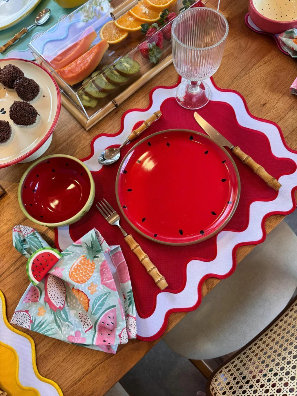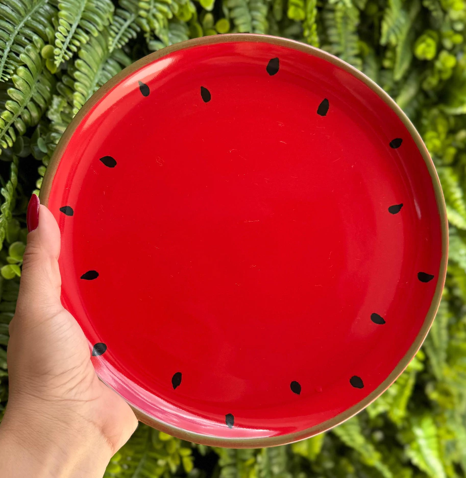 Prato de sobremesa de cerâmica em formato de Melancia dimensão 2x23cm, com borda verde e interior vermelho brilhante, interior com detalhe de sementes pretas