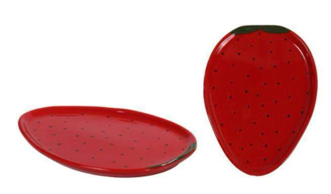 Prato Sobremesa de cerâmica dimensão 1,5x17,5x23,5cm em formato de morango, interior vermelho, pontinhos pretos imitando sementes com detalhe da folha em verde escuro
