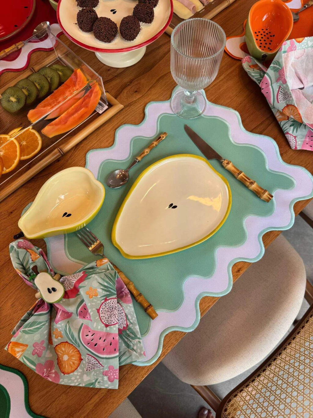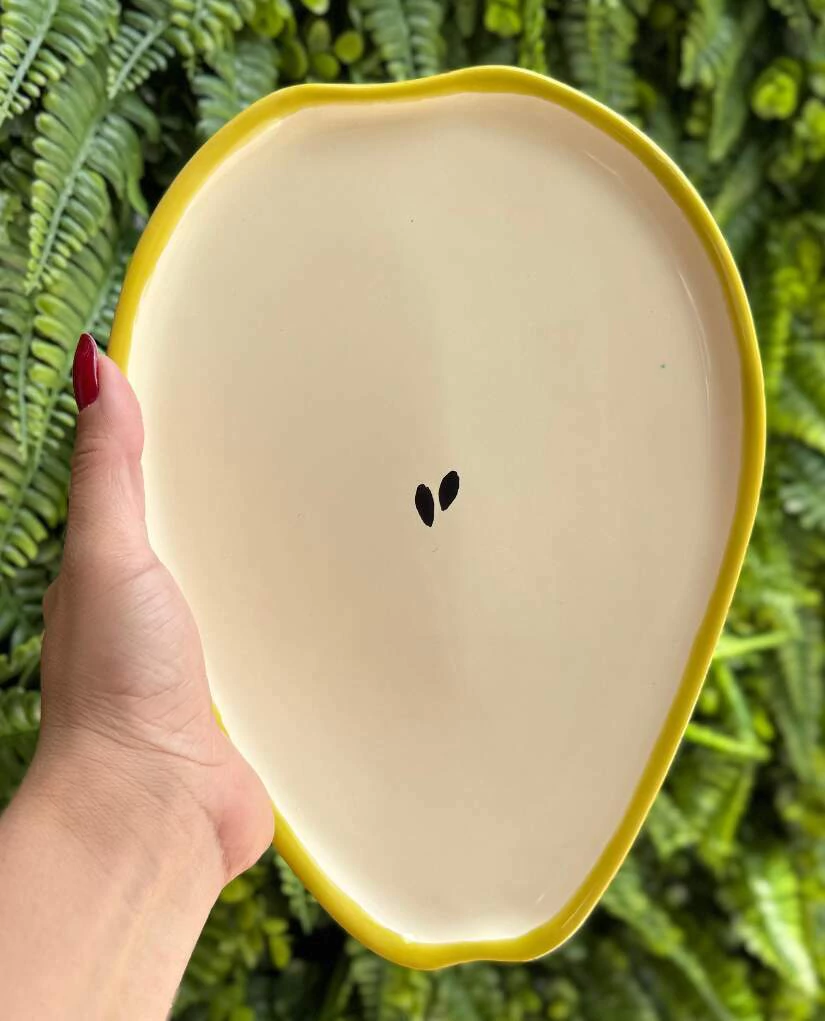 Prato de sobremesa de cerâmica em formato de Pera dimensão 1,5x18x24cm, com borda amarelo brilhante e interior bege, interior com detalhe de sementes pretas