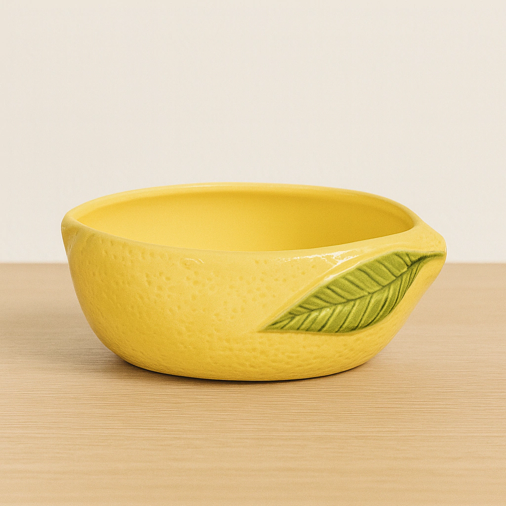A Tigela Grande Limão Siciliano é uma peça que encanta à primeira vista. Com formato inspirado na fruta símbolo do frescor e da alegria, ela traz textura delicada e acabamento em cerâmica vitrificada, realçando os tons vibrantes de amarelo e verde.
