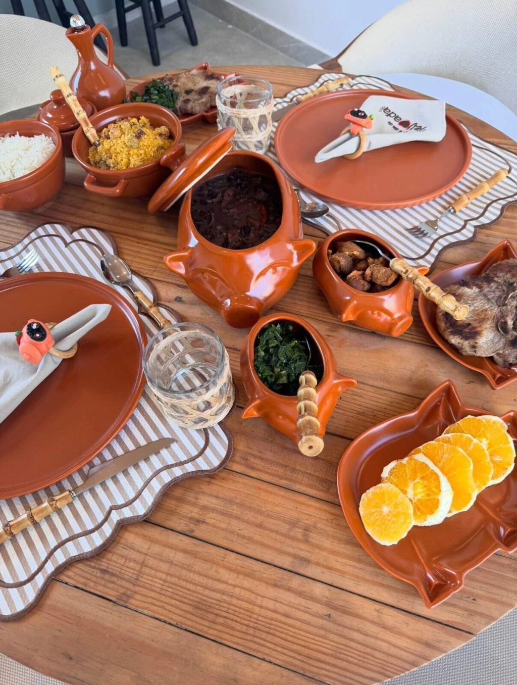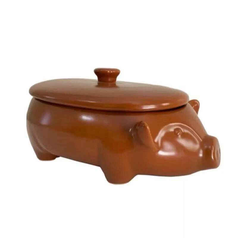 Descrição: Tigela com tampa com desenho de porco, em cerâmicas fosca na cor caramelo, cabe aproximadamente 2 litros.