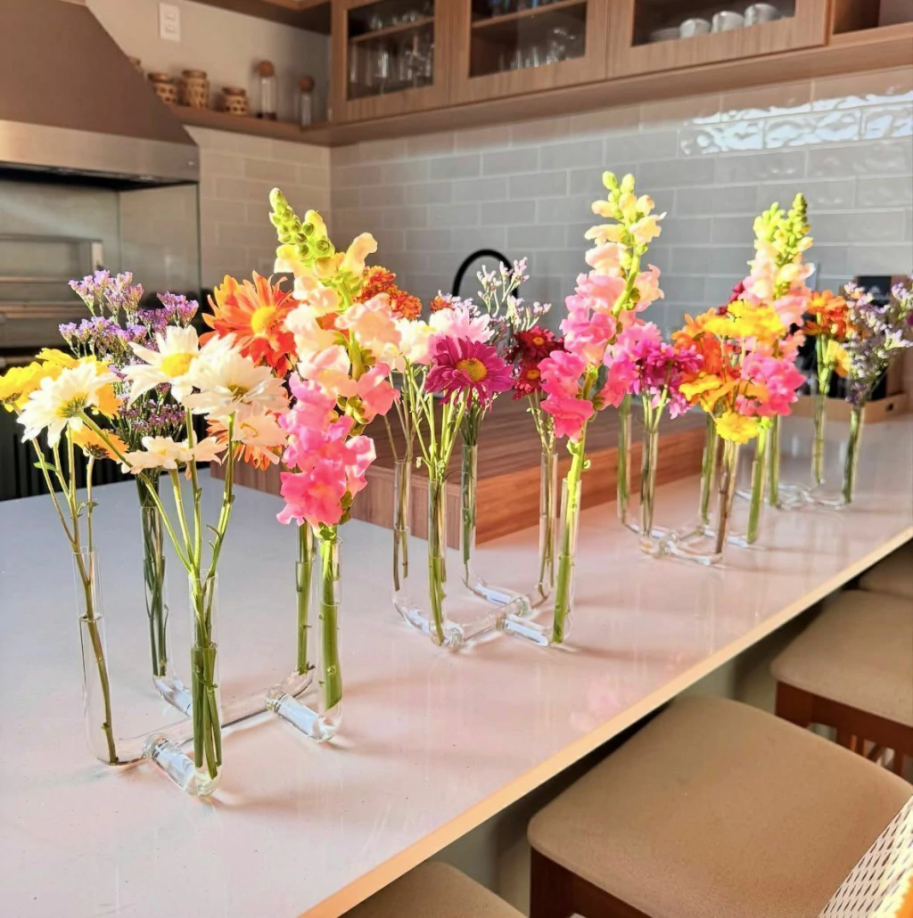 Seu formato com cinco ramificações possibilita criar arranjos criativos e cheios de movimento, valorizando flores naturais ou artificiais. Versátil, pode ser usado em salas, cozinhas, escritórios ou em ocasiões especiais, garantindo um toque contemporâneo e delicado.