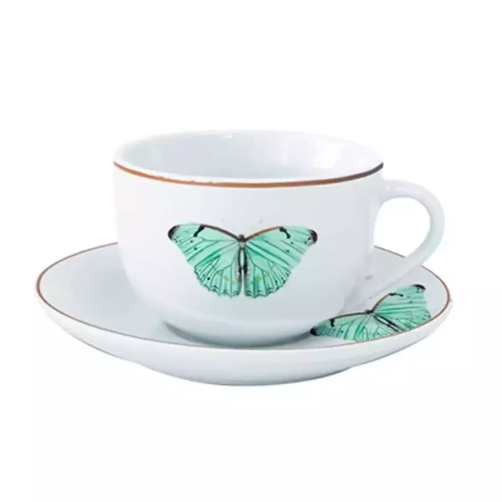 Delicada e charmosa, a Xícara com Pires Borboleta em porcelana é perfeita para deixar os momentos de chá ainda mais especiais. Com estampa de borboleta em tom verde e detalhe de borda marrom, a peça une sofisticação e estilo. A xícara possui capacidade para 220ml, ideal para servir chás e infusões, enquanto o pires complementa com elegância a composição da mesa. Produzida em porcelana de alta qualidade, garante resistência, beleza e um toque de exclusividade em cada uso.